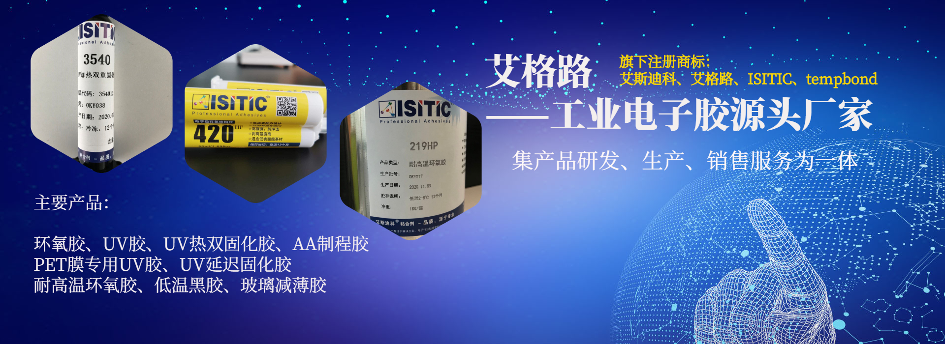 為客戶提供環氧膠、UV膠、臨時粘接膠、UV加熱雙固化膠、丙烯酸結構膠等工業電子用膠解決方案
